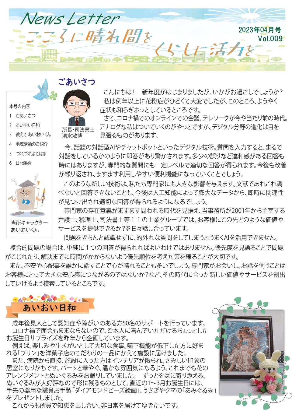 当所ではこれまで以上に地域を支え、皆さまのくらしに寄り添う事務所となれるようにと想いを込め、年2回(4月、10月)にお役に立つ情報や事務所の近況をお届けしています。